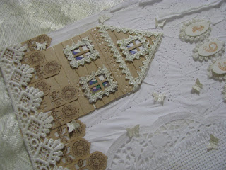 Для усложнения фактуры добавила на страничку тонированную дистресс чернилами клеевую паутинку (ну очень мне нравится как она выглядит на страничках. Но для себя сделала вывод, что в следующий раз все же буду тонировать ее с помощью кофе. И цвет получается лучше и сама она становится жестче и фактурнее). А еще кальку: кружевной край под кроссвордом и полоску справа.